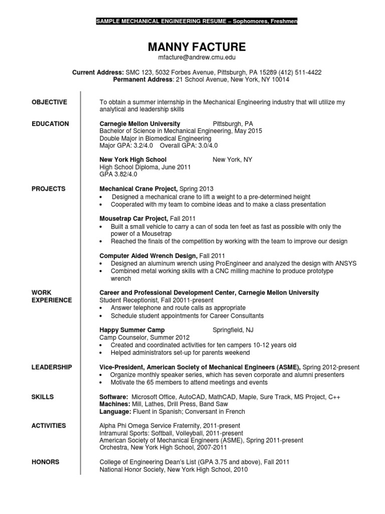 Meche Sample Resumes PDF Carnegie Mellon University Mechanical
