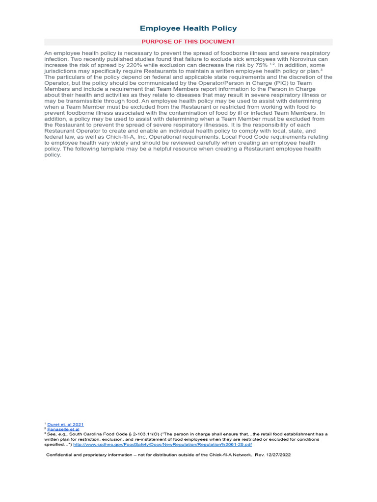 It is caused by eating foods contaminated with toxins. Prepare a written handout of your policy for employees to take home and read on their own. This policy document explains which symptoms and illnesses employees must report to their managers and what managers must do when they receive. The purpose of this agreement is to inform conditional employees or food.