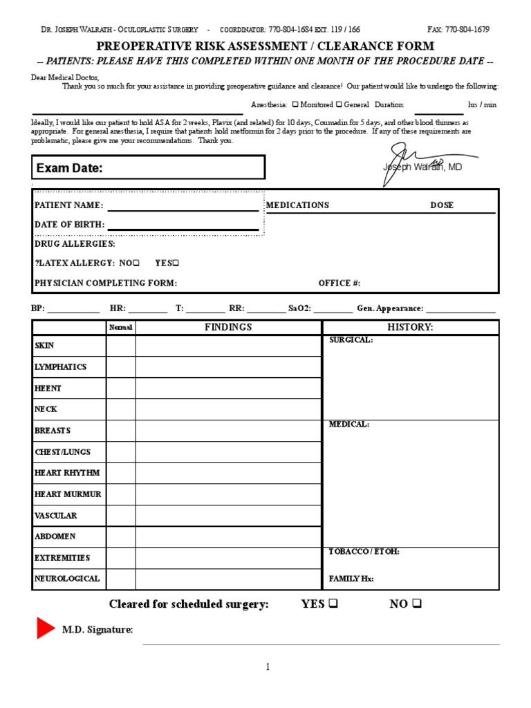 Pre Op Clearance Template