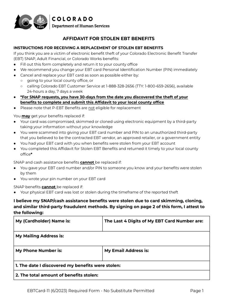Report of EBT Theft Cardholder Affidavit (English) PDF Supplemental